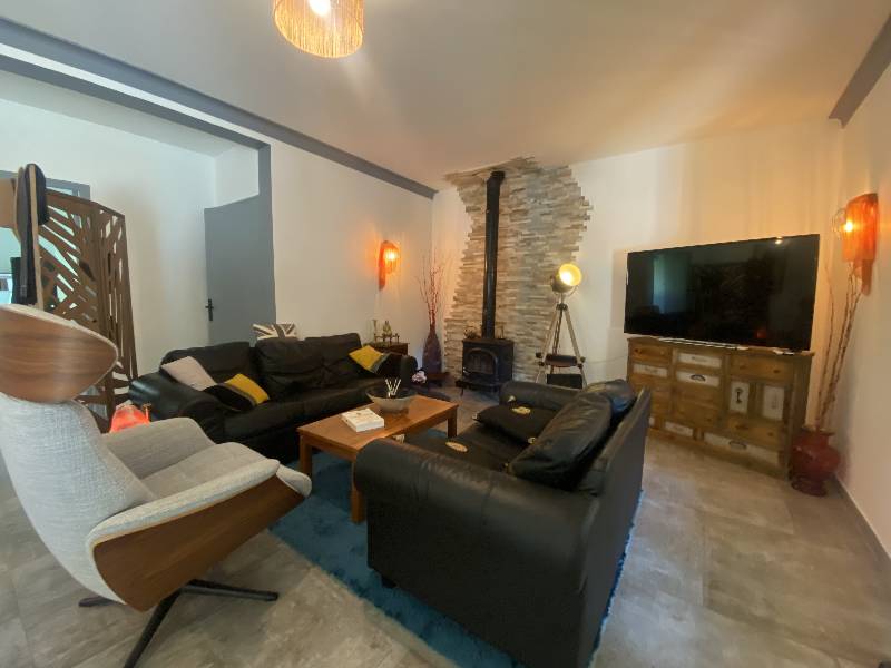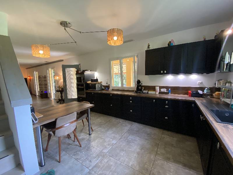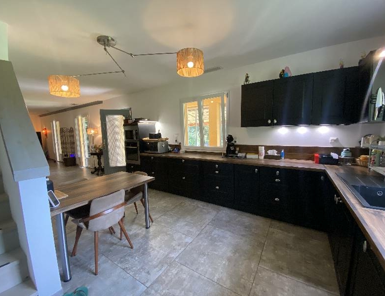 Rez-de-chaussée : salon avec poêle à bois, salle à manger (42m² environ) avec cuisine ouverte (17m² environ). Placard.