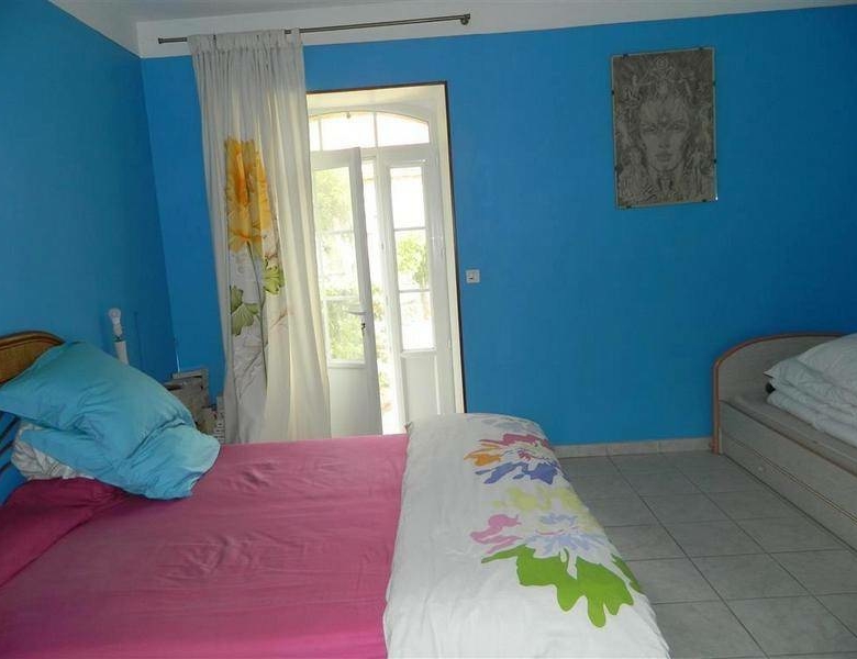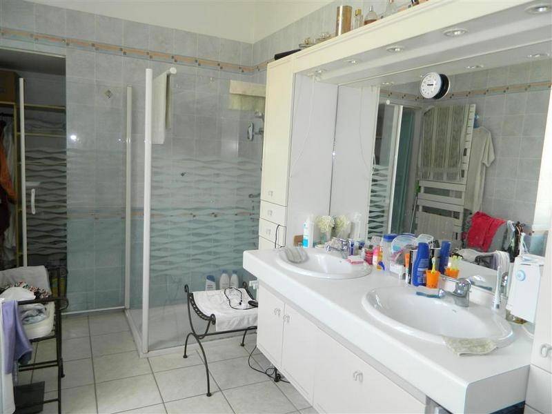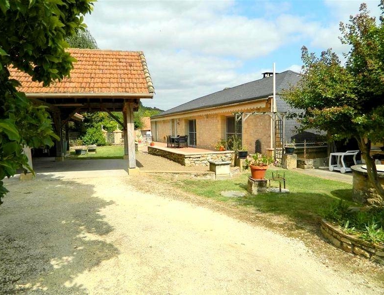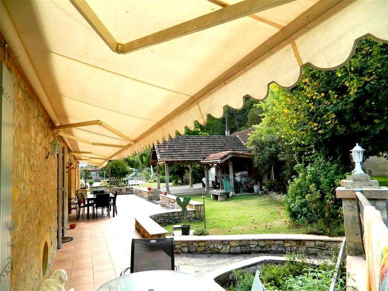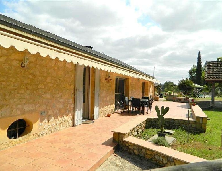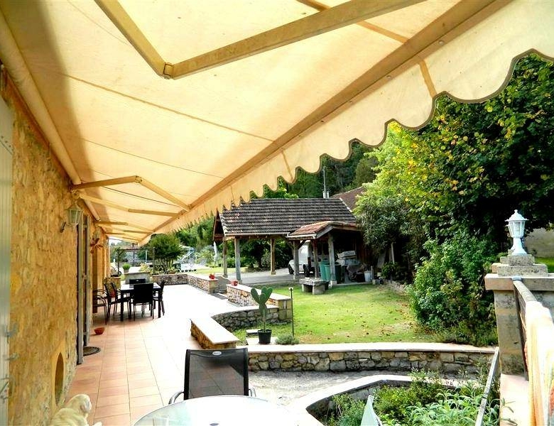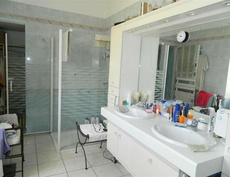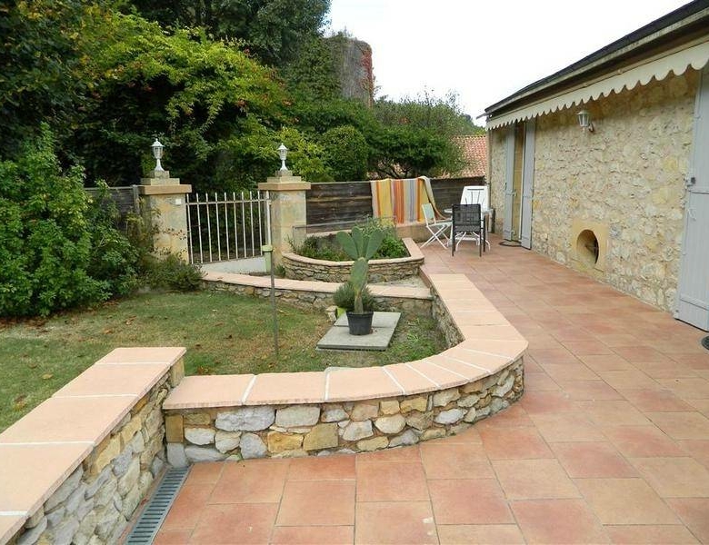 Son terrain clôturé sur lequel donne les pièces de vie au 2ème étage, offre terrasses, piscine (4×10), abri (50 m2) et dépendance (20 m2). ; il y a aussi une dépendance en pierre (50 m2) au niveau de la rue.