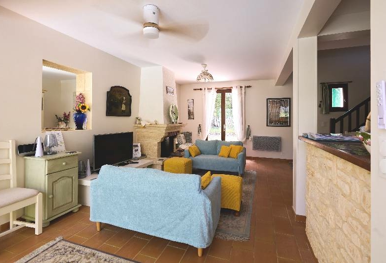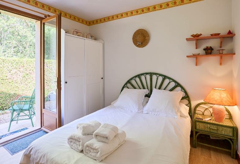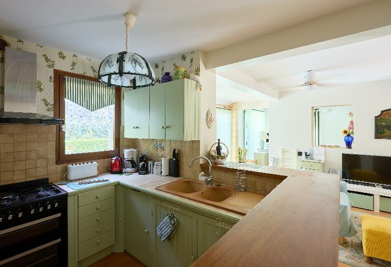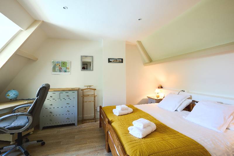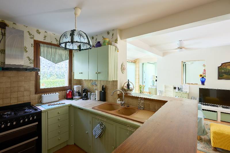 – au rdc : entrée avec coin bureau (13 m²), pièce de vie avec coin cuisine équipée (et arrière-cuisine), cheminée, baie vitrée ouvrant sur terrasse et jardin (47 m²), 2 chambres avec porte-fenêtre sur terrasse et jardin (1 avec des placards intégrés ; 12 et 10 m²), salle d’eau et Wc, Wc séparé avec lave-mains, couloir avec de nombreux rangements.