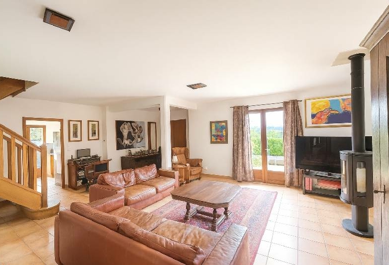 Rez-de-chaussée : Grand séjour / salle à manger de 55 m² avec poêle à bois et accès direct aux terrasses, cuisine de 17 m², buanderie, salle deau avec lavabo, deux WC