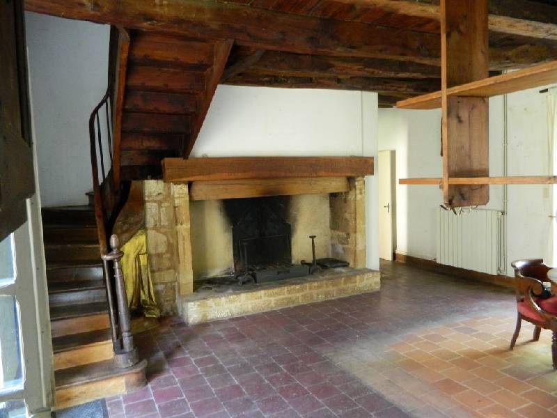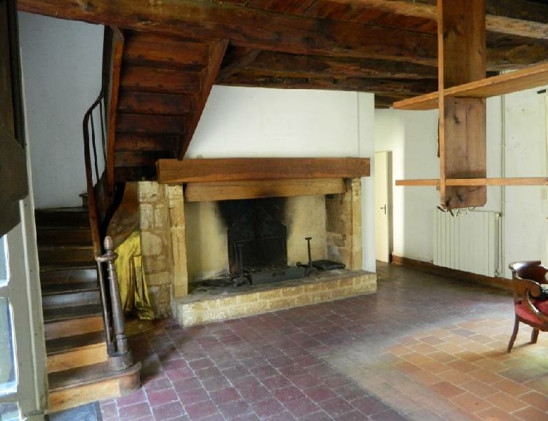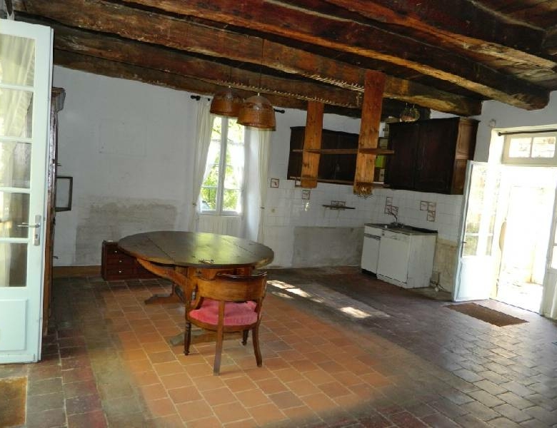 En rez de chaussée sous poutres apparentes, une grande cuisine (32 m2 env.) traversante avec cheminée jouxte un salon (27 m2 env.) traversant également ; une salle deau / WC