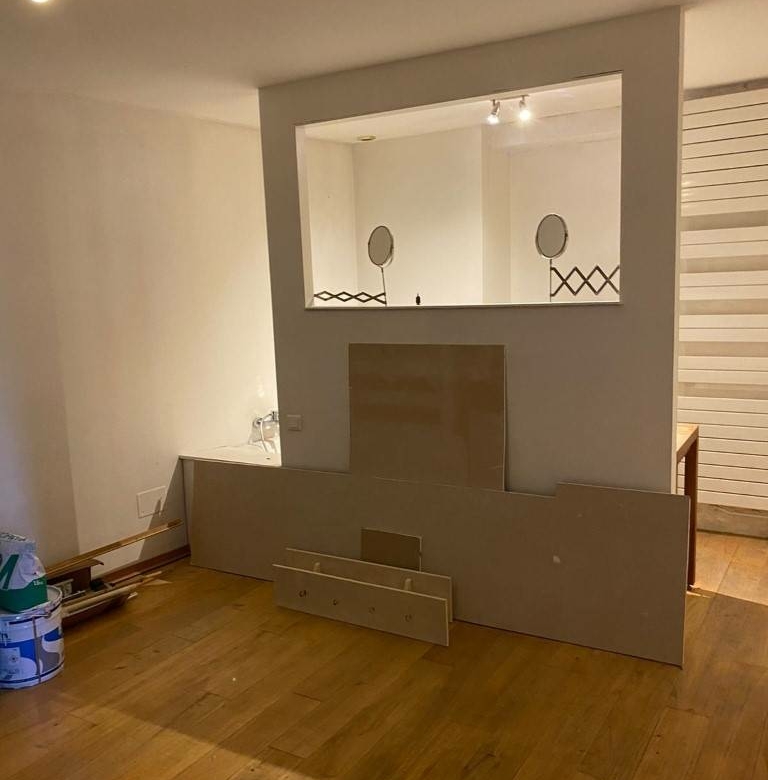 En RdC, un salon traversant (60 m2) avec cheminée ouverte et escalier vers les étages, une cuisine (non équipée) ouverte sur salon et avec arrière-cuisine, les 2 pièces avec baie vitrée resp. sur une terrasse (40 m2) , une chambre avec salle de bain ouverte et porte fenêtre sur jardin, un bureau, un WC.