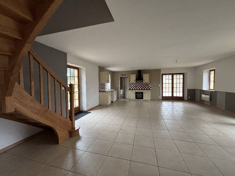 Maison (130m² env.). RDC ; , Rez-de-chaussée : séjour avec coin-cuisine et poêle a bois (53m² environ), chambre (11 m² environ), salle de bains avec WC (11m² environ), arrière cuisine.