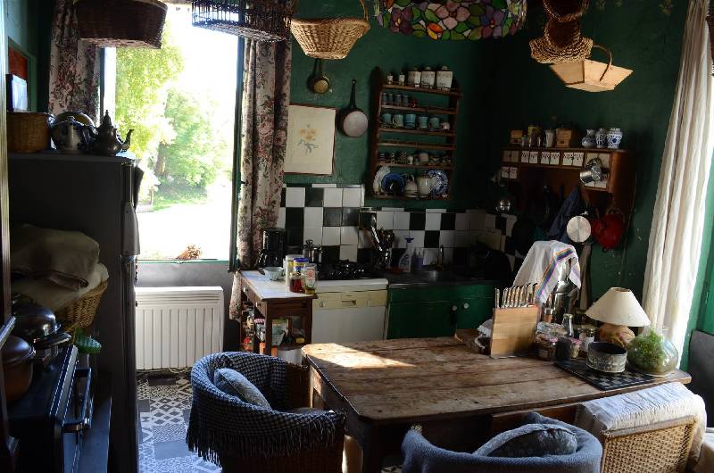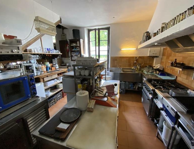 House, ground floor: professionally equipped kitchen (23m²), restaurant with large authentic fire place (49m²), WC and bathroom (8m²).