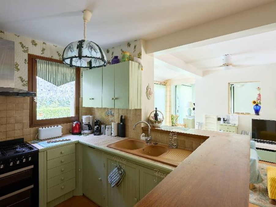 - au rdc : entrée avec coin bureau (13 m²), pièce de vie avec coin cuisine équipée (et arrière-cuisine), cheminée, baie vitrée ouvrant sur terrasse et jardin (47 m²), 2 chambres avec porte-fenêtre sur terrasse et jardin (1 avec des placards intégrés ; 12 et 10 m²), salle d'eau et Wc, Wc séparé avec lave-mains, couloir avec de nombreux rangements.