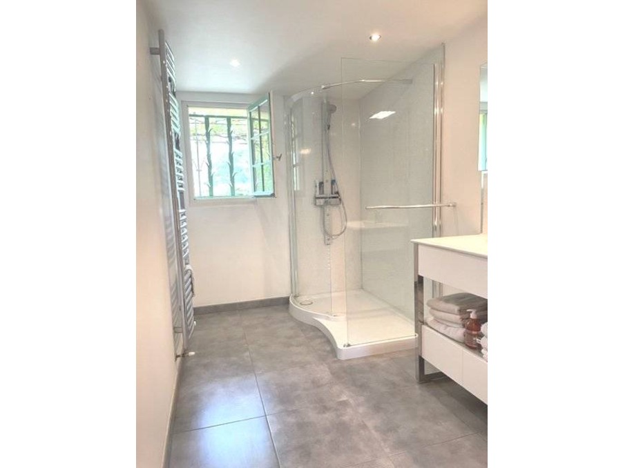 - en rdc surélevé : entrée, cuisine équipée ouverte sur vaste séjour avec cheminée, 2 portes-fenêtres sur terrasse avec vue et 1 porte-fenêtre sur terrasse couverte (51 m² env.), 1 chambre (11 m²) parentale avec salle d'eau et Wc, 3 autres chambres (11, 10 et 9 m²), salle de bains, Wc séparé avec lave-mains.