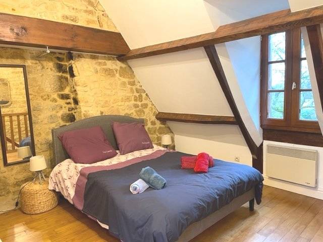 - au 2nd étage : 1 chambre ensuite, pierres et poutres apparentes, parquet au sol (salle de bains et wc) (14 m² en tout).