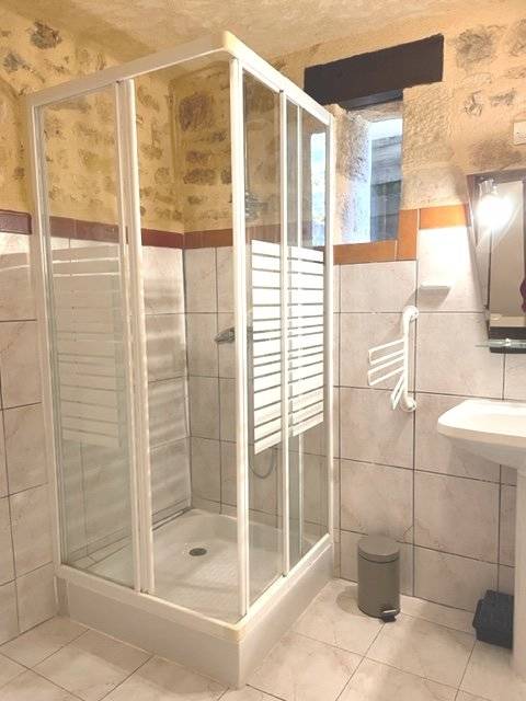 - au rdc : entrée, 1 chambre ensuite carrelée, pierres et poutres apparentes, porte-fenêtre sur la terrasse (salle d'eau et wc) (19 m² en tout).