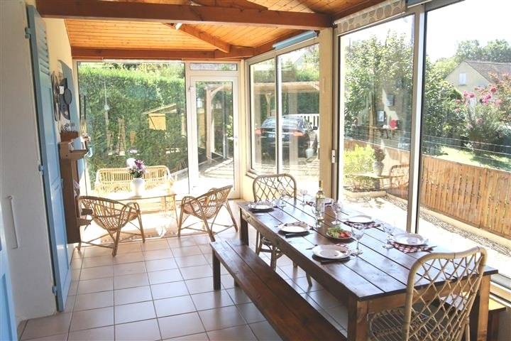 - au rdc : une véranda de 21 m² ouvre sur le jardin, entrée avec placard, cuisine équipée (7 m²) ouvrant sur une pièce de vie de 20 m², 2 portes-fenêtres ouvrant sur véranda, 1 chambre (11 m²), salle deau avec Wc.