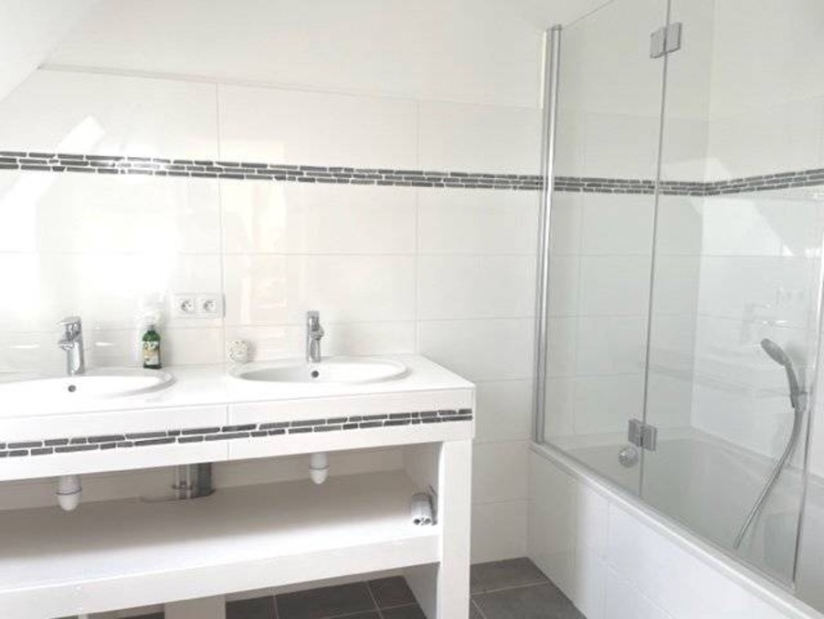 - à l'étage : 1 chambre (13 m²) ensuite (salle de bains et wc, 5 m²) avec placards intégrés et terrasse privative, 2 autres chambres avec placards intégrés (10 et 9 m²), salle d'eau et wc, couloir avec de nombreux rangements.