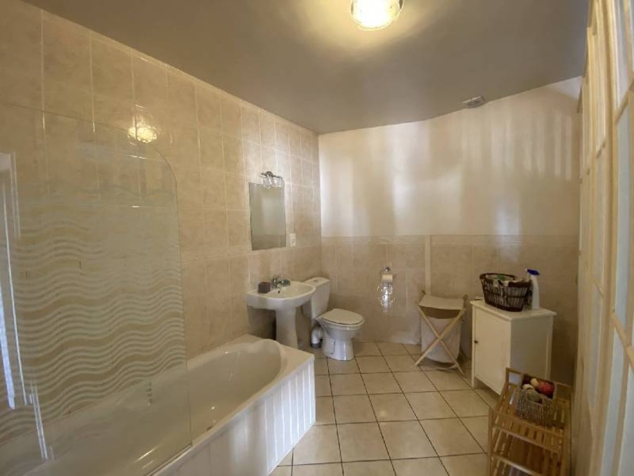 A létage ; chambre (13 m² environ), séjour (14m² environ), salle de bains/WC (7m² environ), palier (7m² environ)