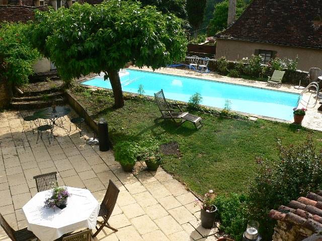 Maison périgourdine (105 m² environ) avec piscine (9x4m , chauffée), jardin et terrasse sur un terrain de 390 m² dans le hauteur du village. Terrasse avec barbecue.