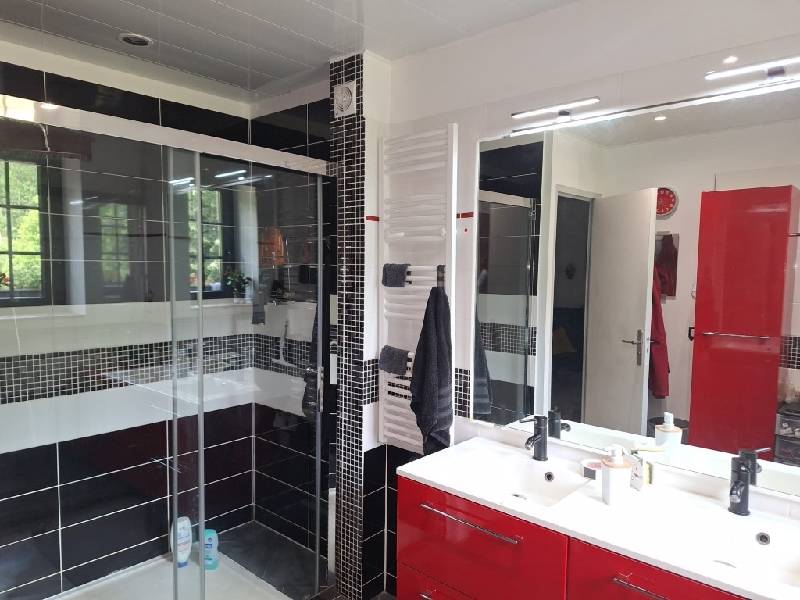 En rez-de chaussée, la salle à manger (29 m2) avec poêle à bois, est ouverte sur le salon (31 m2) avec insert, entièrement vitré sur 2 côtés. Elle distribue également une chambre en suite avec salle deau / WC (12 m2), une cuisine moderne (28 m2) et un WC invité avec lave main.